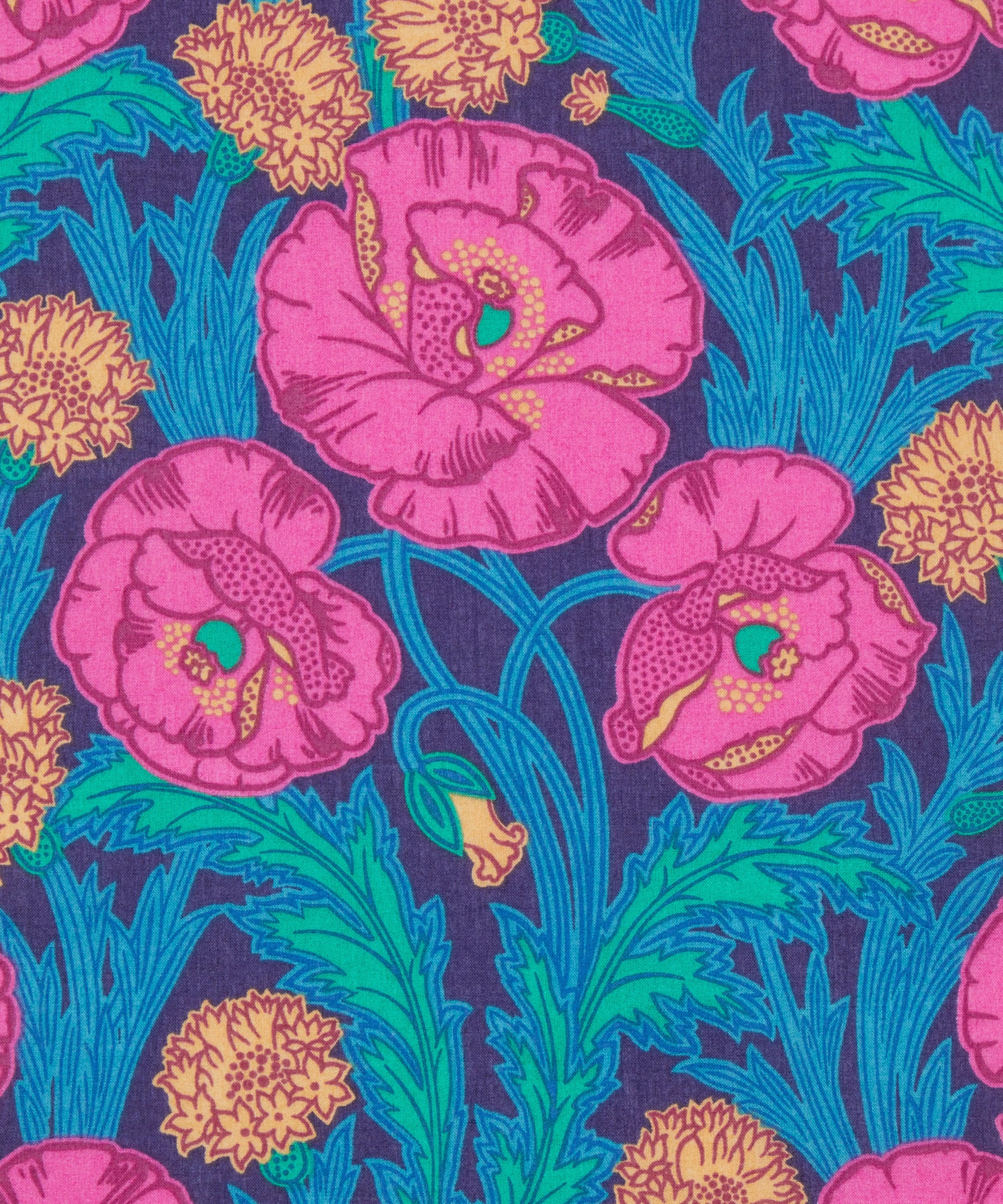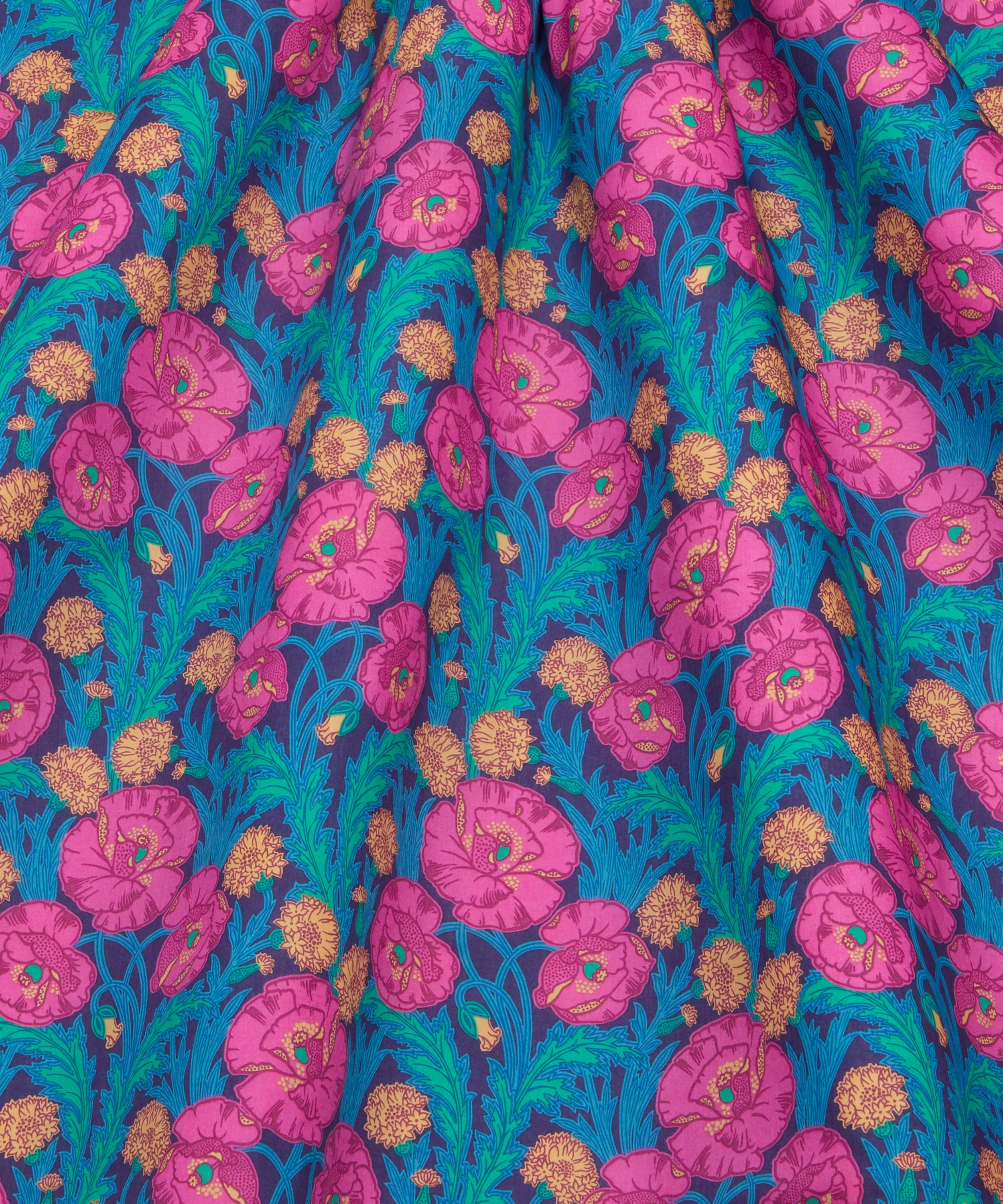 Maud’s Posy is a tribute to one of Liberty’s signature flowers- the iconic poppy. Hand-painted in the early 1980s, this sophisticated botanical is a contemporary rendition of a typical Art Nouveau design. Elegant trailing poppies, winding foliage and pops of stylised carnations are emphasised by richly coloured grounds and bold outlines. This print is part of the Floral Library narrative of the AW24 collection, which studies the subject through the Botanist’s eye, cataloguing and exploring an assortment of species as well as a being a celebration of key florals throughout Liberty’s history.