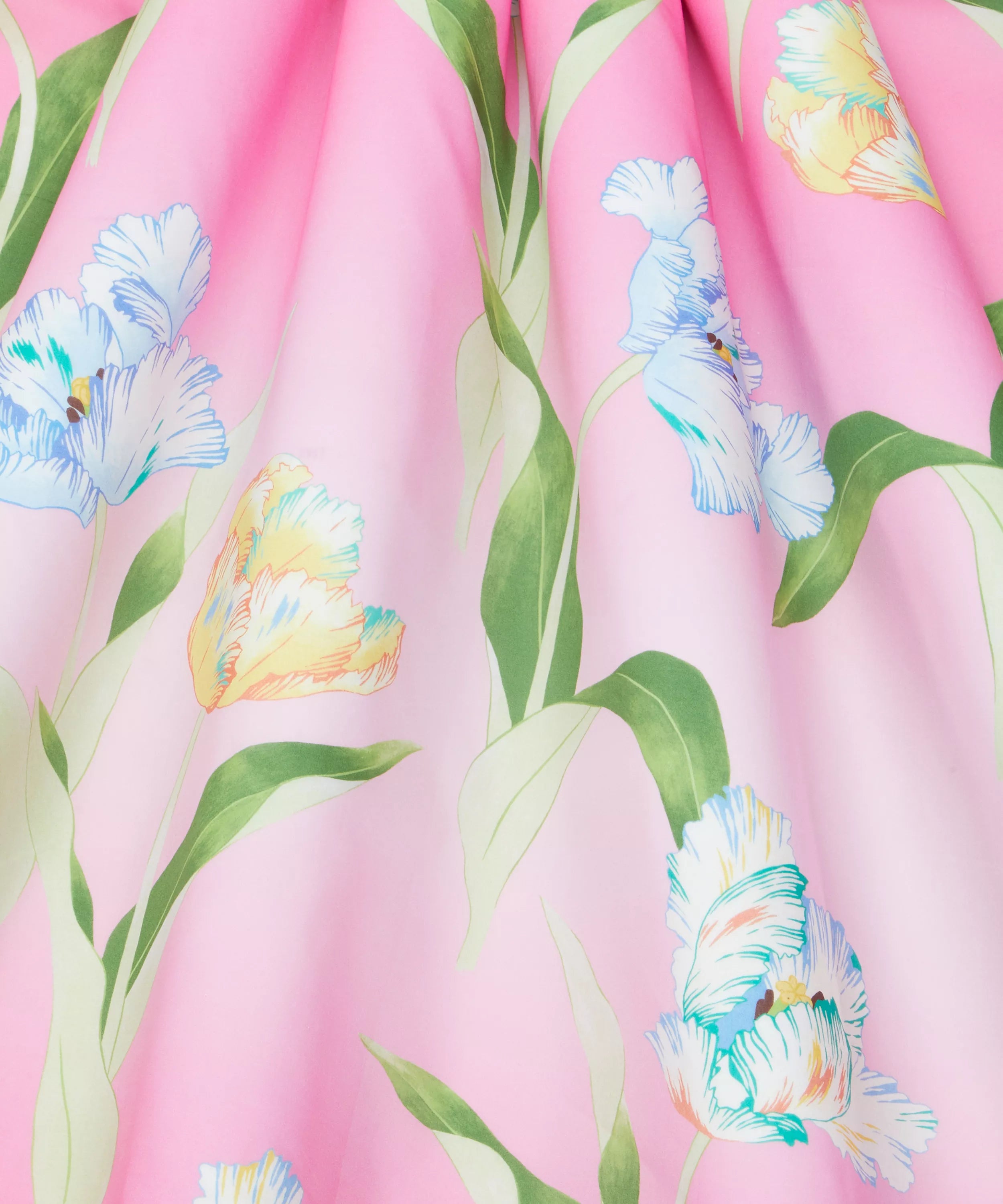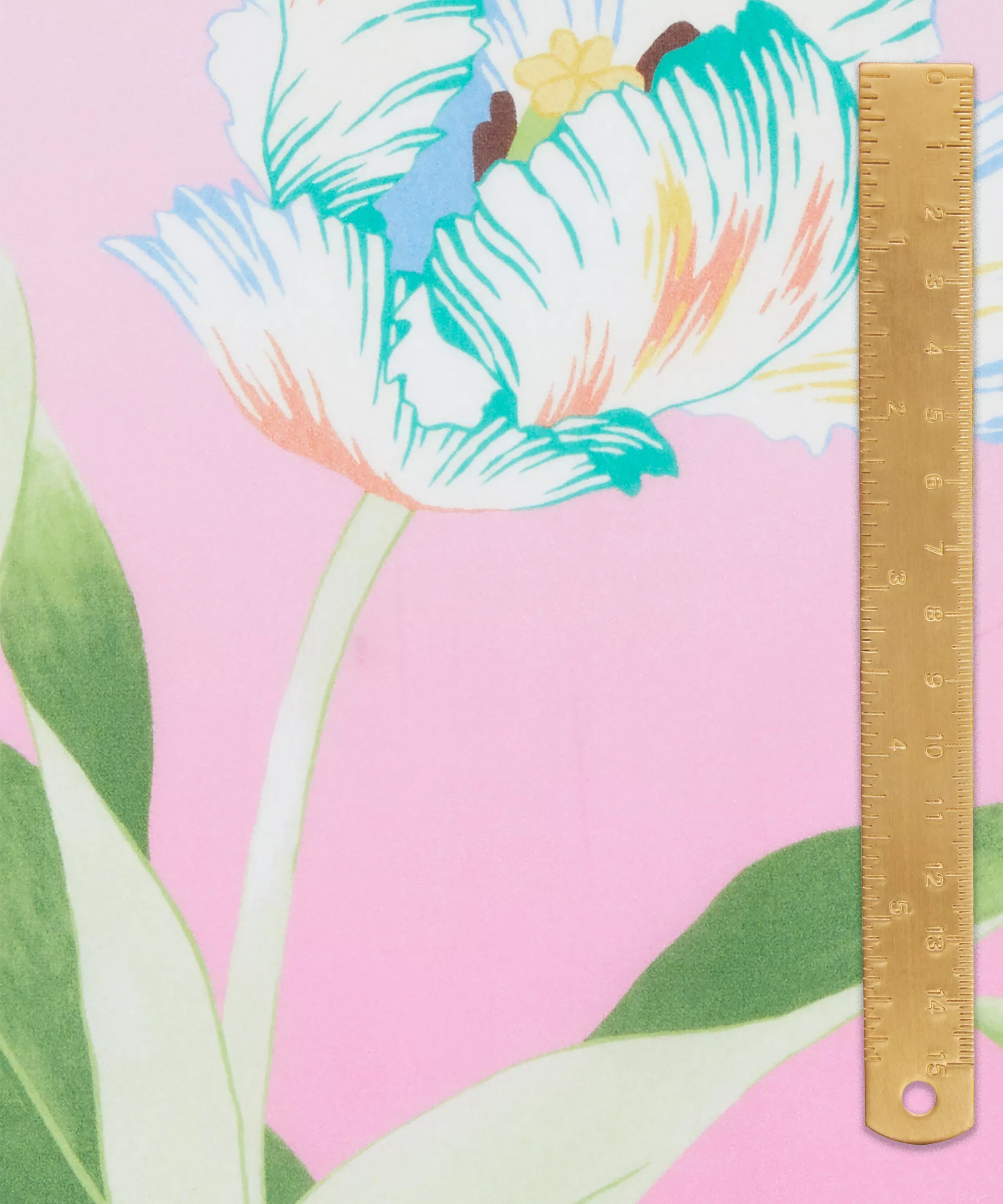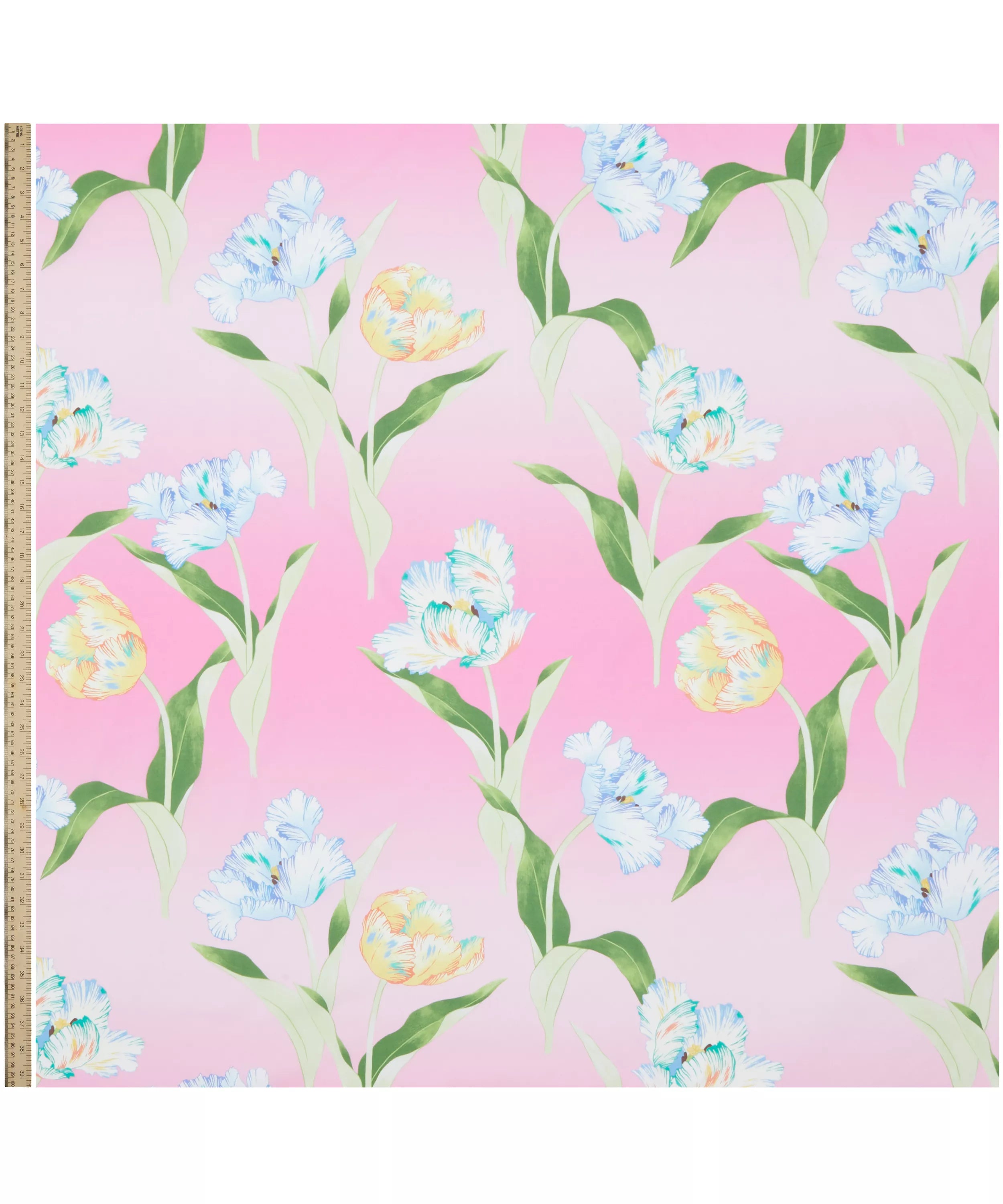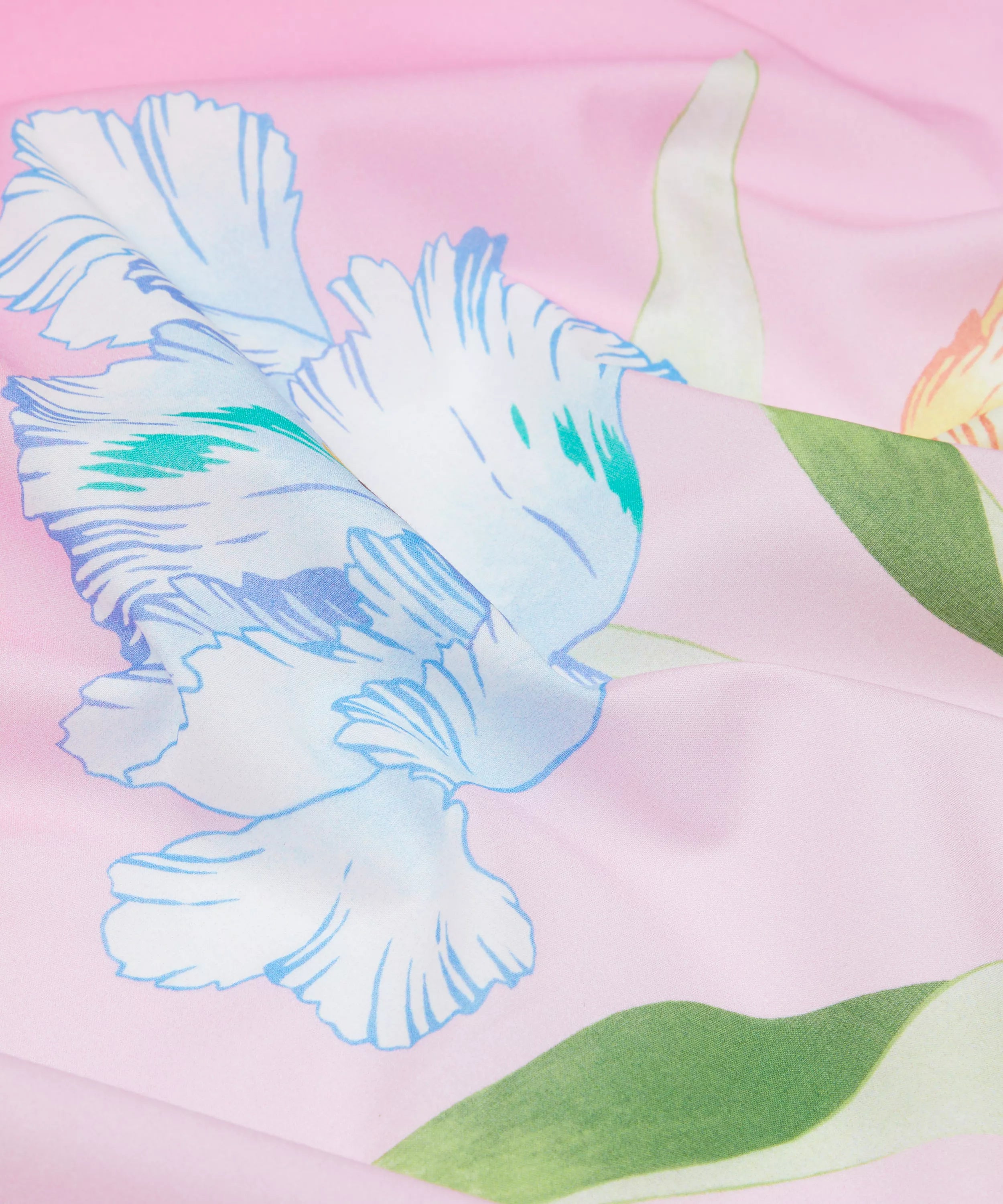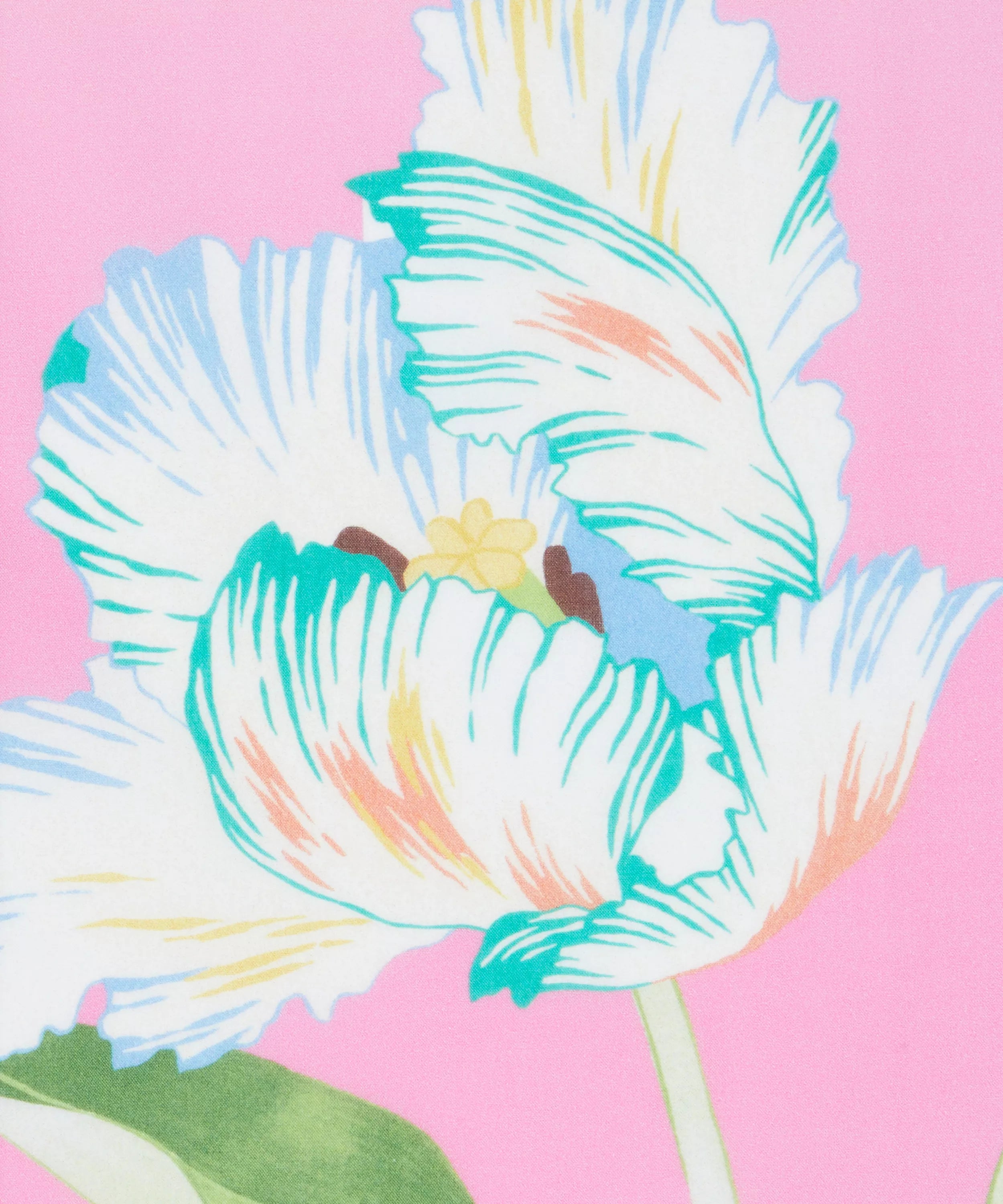 This design was inspired by Ohara Koson, a well-known Japanese woodblock artist who created traditional nature-inspired prints in the early 20th century. Its style mimics the woodblock prints of that era, with a simple composition and ombré background. The rainbow parrot tulip motif is painted in gouache, rendered in delicate washes and fine lines. This print is part of the Spectrum story of our Spring/Summer 2024 collection - influenced by eclectic modern art movements, from the bold complementary hues of Fauvism to the synesthete musicality of the Orphists, with designs paying tribute to a vibrant array of colourful phenomena and pigment conception.