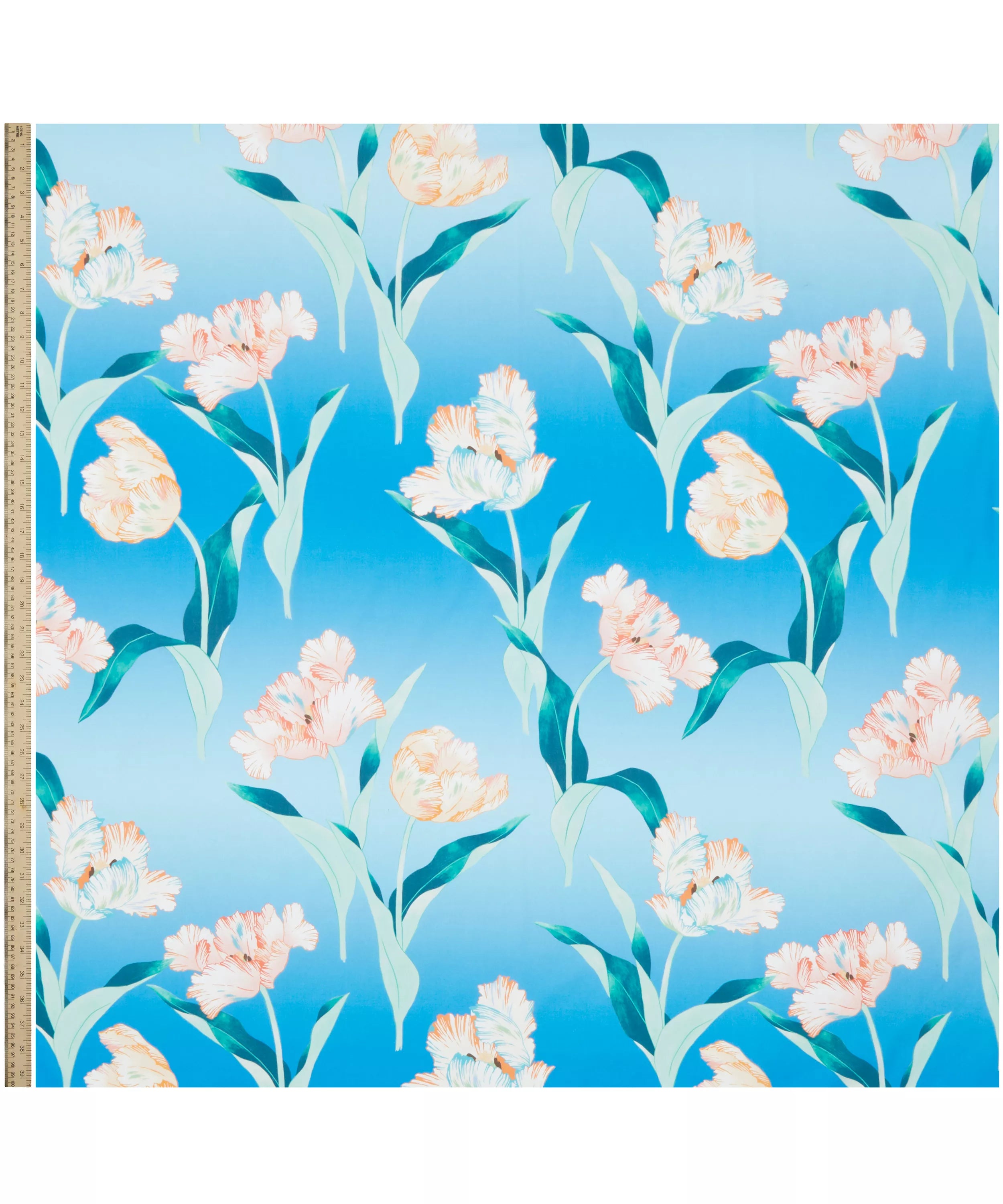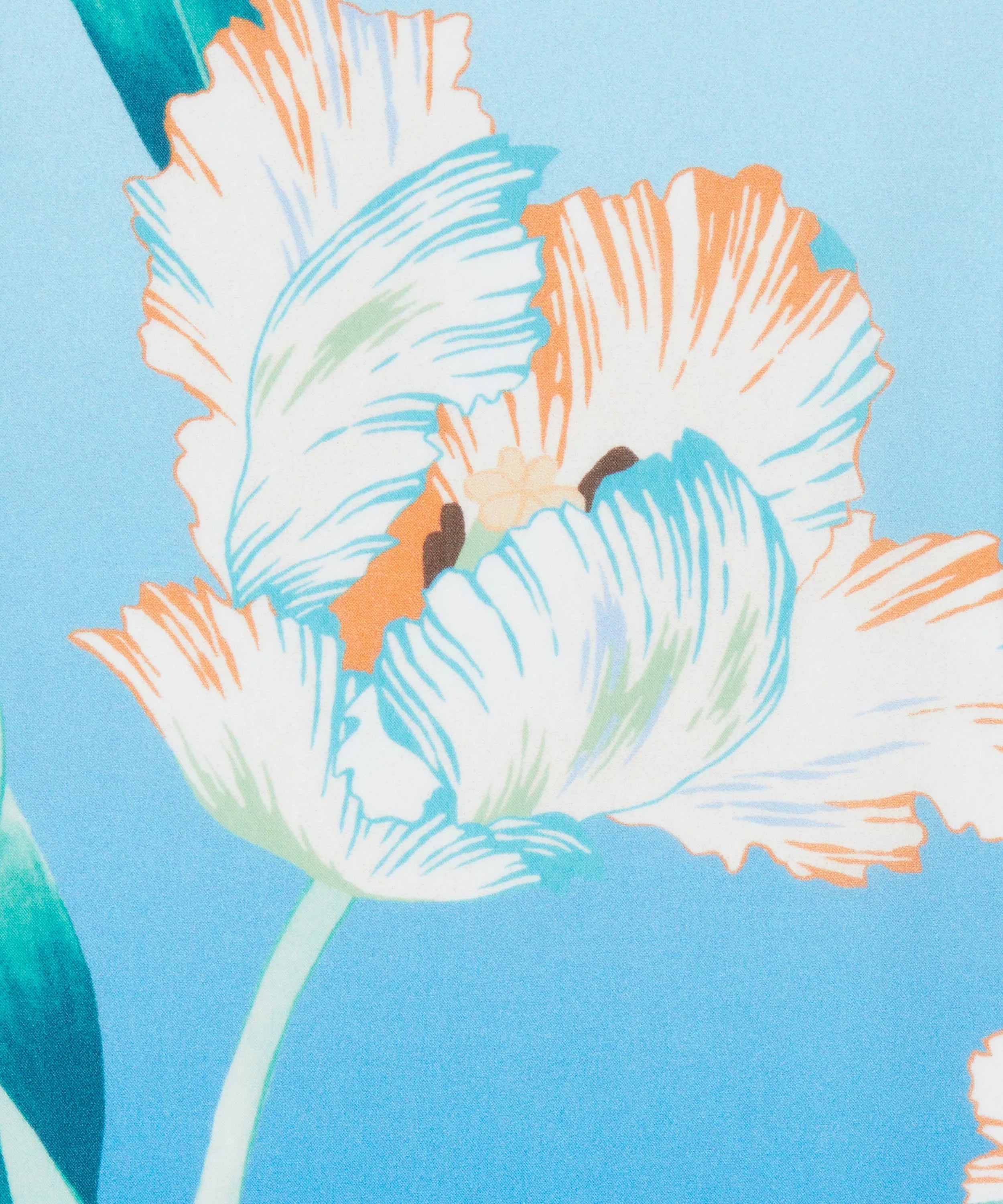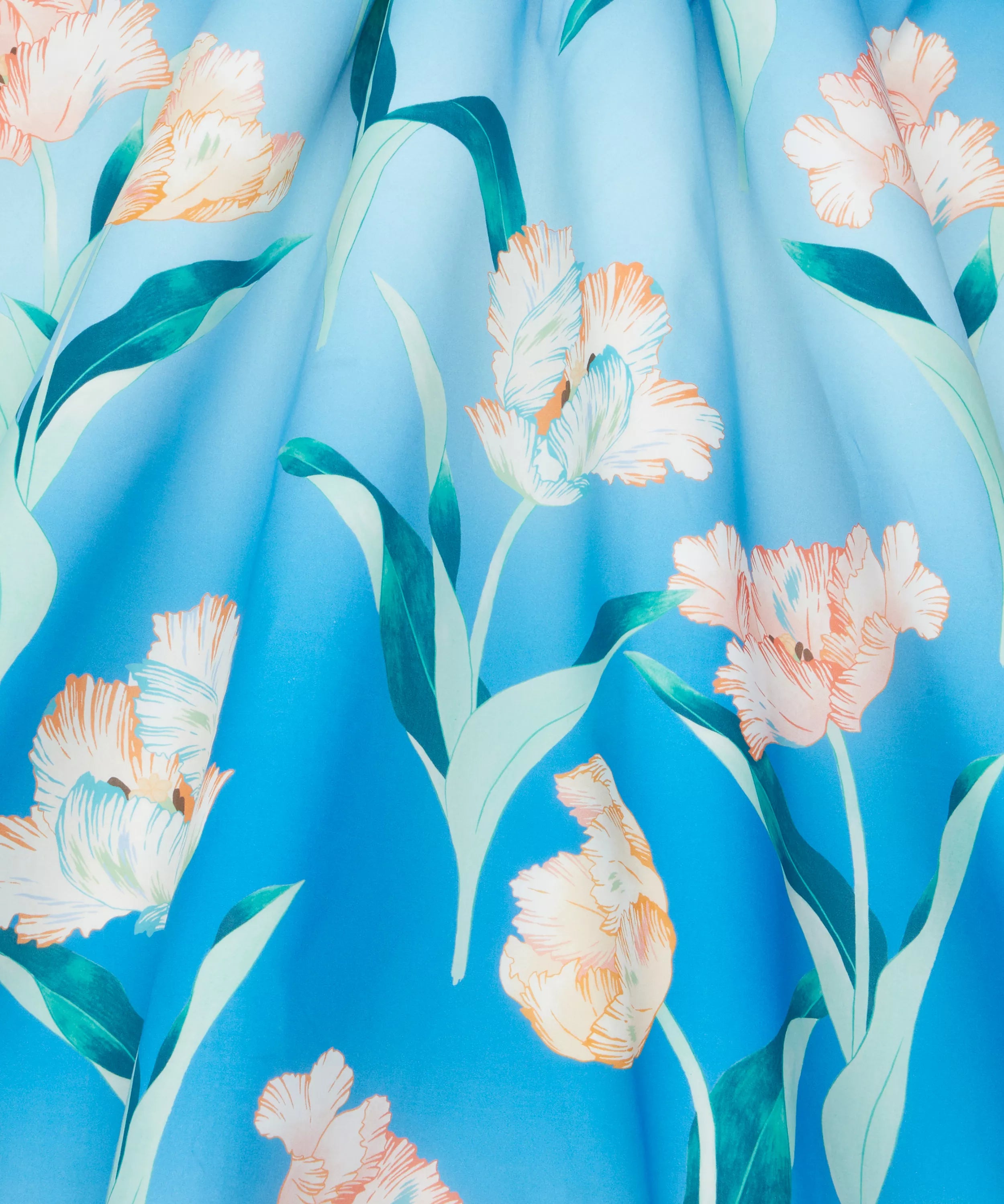 This design was inspired by Ohara Koson, a well-known Japanese woodblock artist who created traditional nature-inspired prints in the early 20th century. Its style mimics the woodblock prints of that era, with a simple composition and ombré background. The rainbow parrot tulip motif is painted in gouache, rendered in delicate washes and fine lines. This print is part of the Spectrum story of our Spring/Summer 2024 collection - influenced by eclectic modern art movements, from the bold complementary hues of Fauvism to the synesthete musicality of the Orphists, with designs paying tribute to a vibrant array of colourful phenomena and pigment conception.