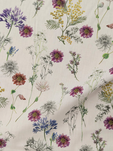 Explore the rare and wonderful plants native to the Southern Hemisphere in Polka Floral. Discover a variety of floral species, including agapanthus, mimosa, flannel flower, waxflower, and Australian strawflower, in this unique landscape hand-painted with watercolour and pencil hatching.