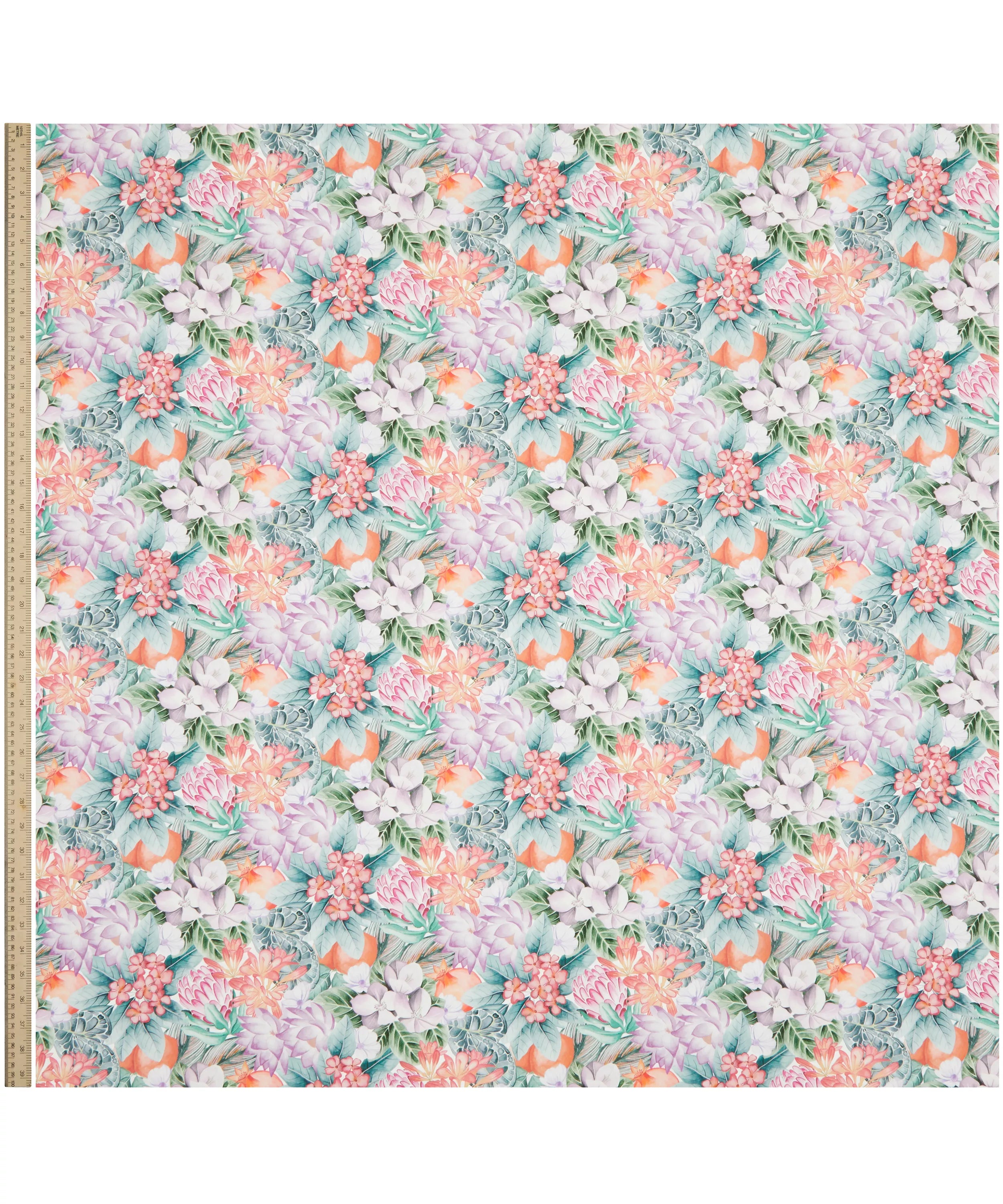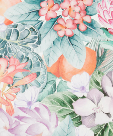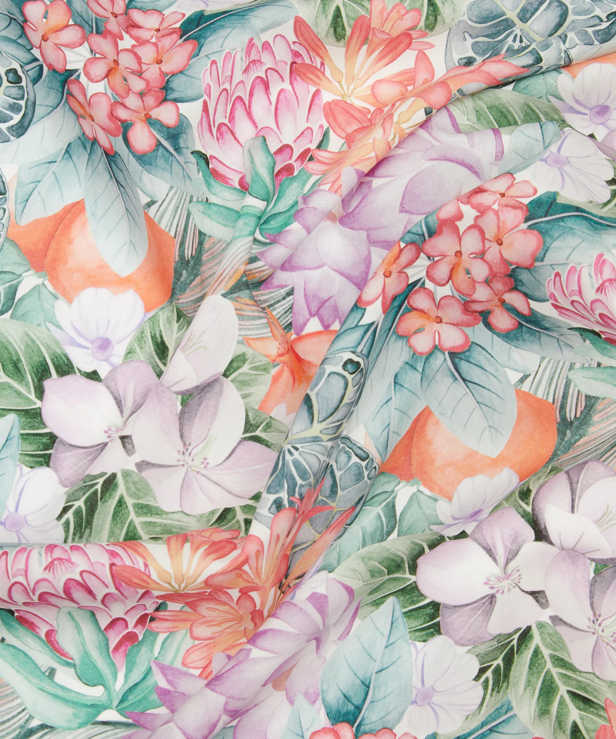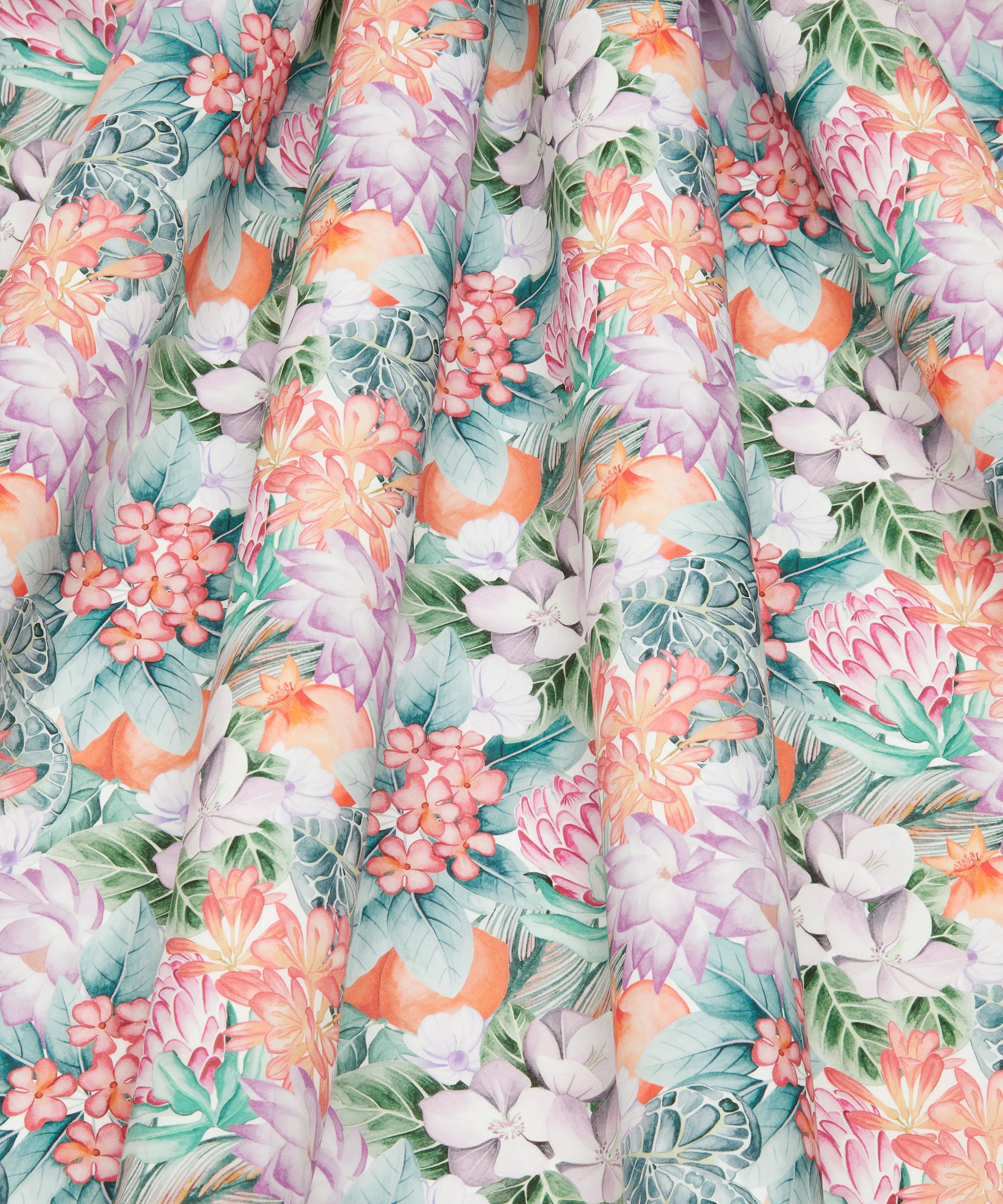 Poppy and Freddie was inspired by the extravagant costumes worn by Josephine Baker, a world-renowned performer, World War II spy, and activist. Hand-painted in the Liberty design studio using layers of watercolour, this tropical floral print showcases zesty fruits like pomegranates and lemons, alongside waterlilies and protea blooms, all nestled within dense foliage.
