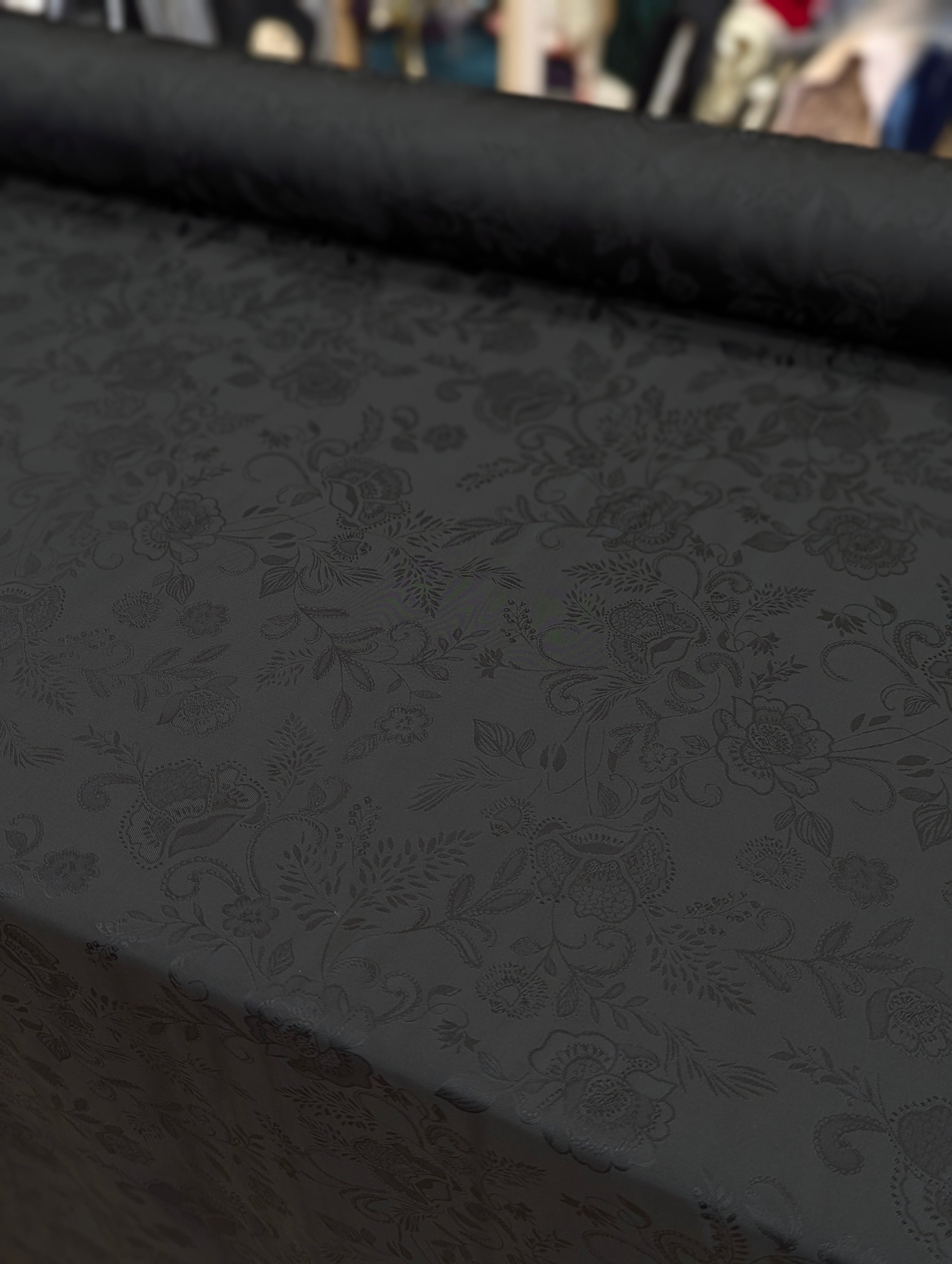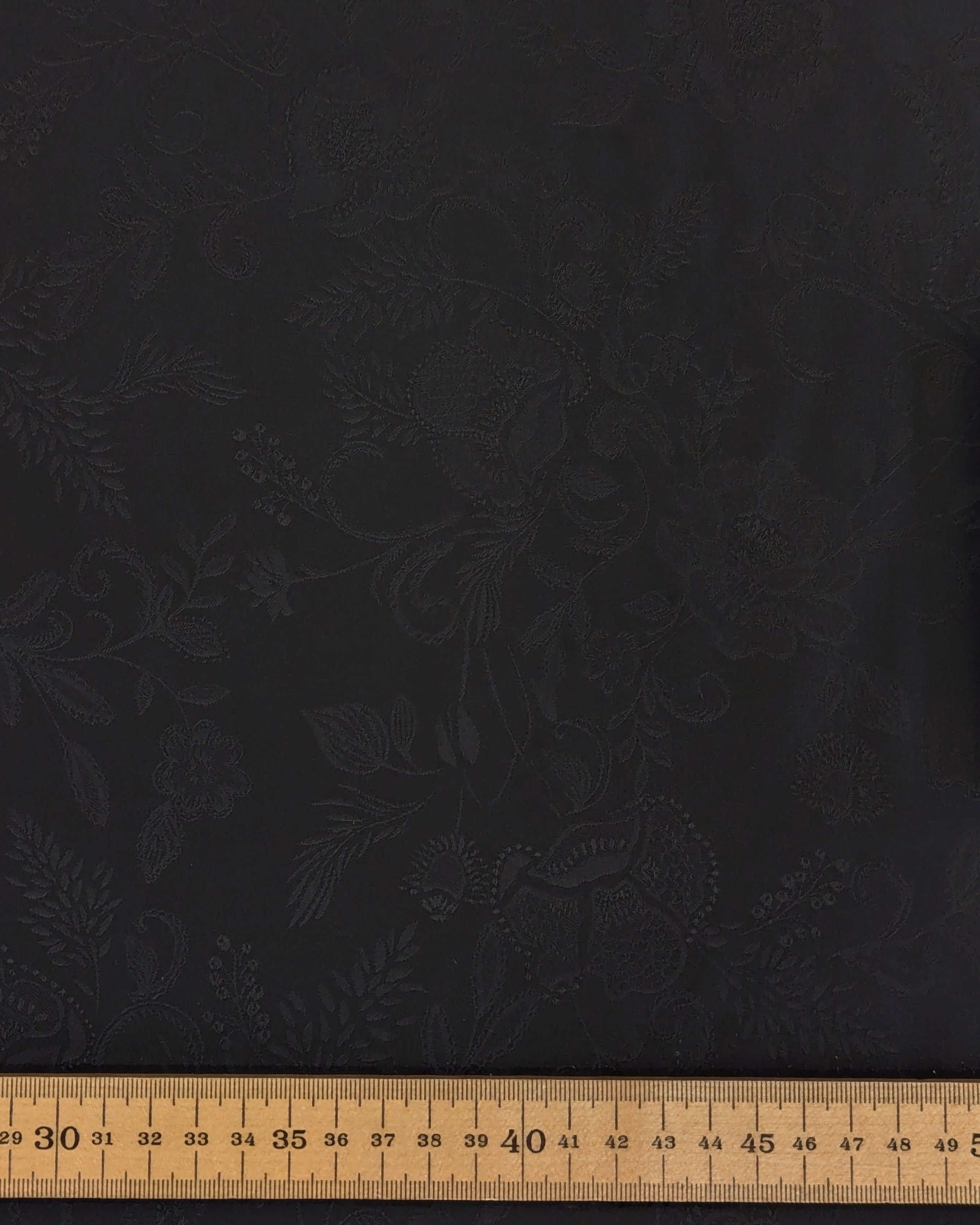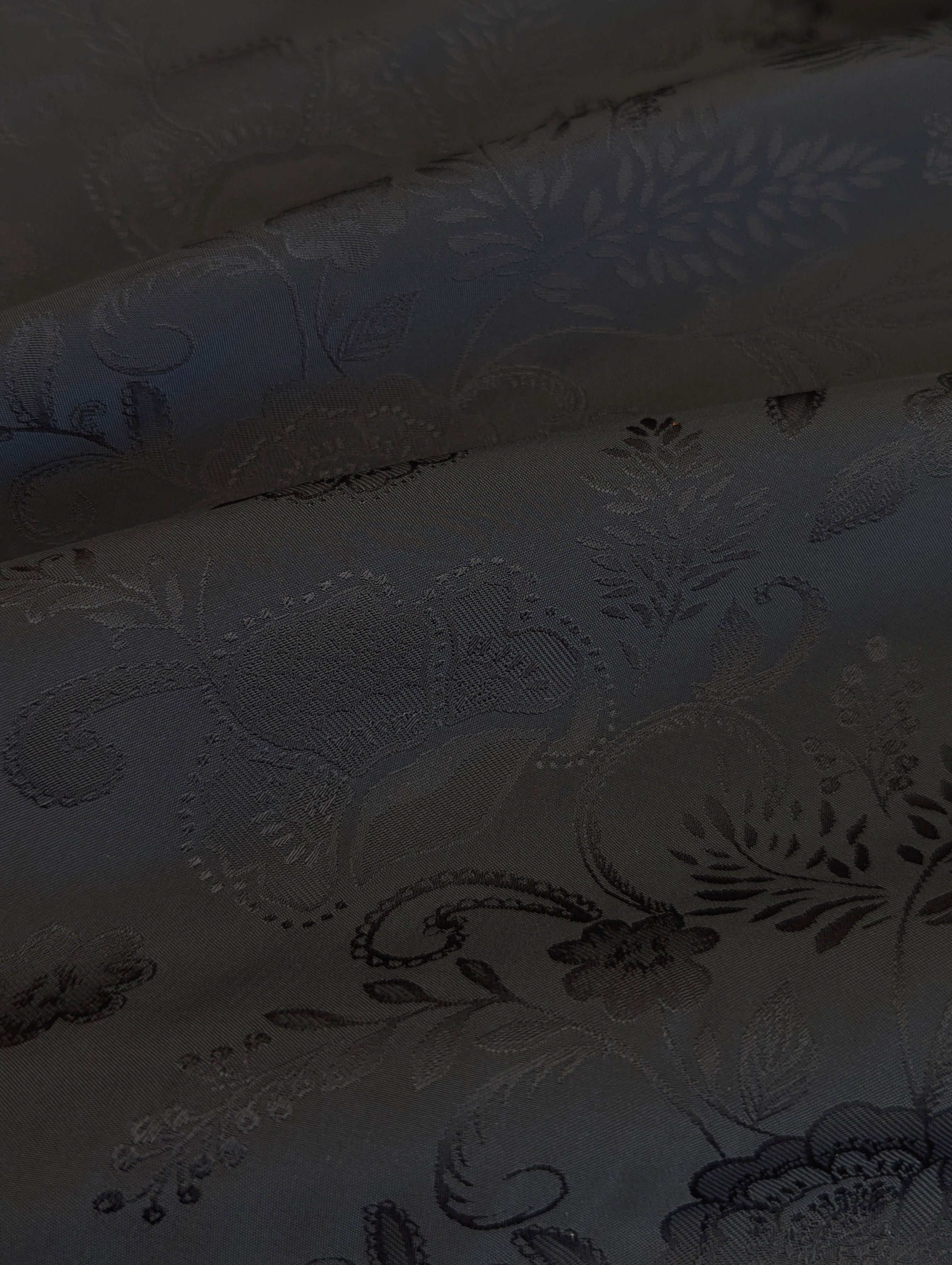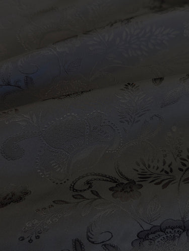 An elegant Viscose Jacquard Satin Crepe, woven in Italy for Liberty London. This refined double-weave fabric has a fluid drape with a soft hand, perfect for garments that need to hold their shape while flowing beautifully on the body. The self-colour black jacquard reveals a gentle pattern of florals, giving the surface subtle depth and modern texture when it catches the light.
